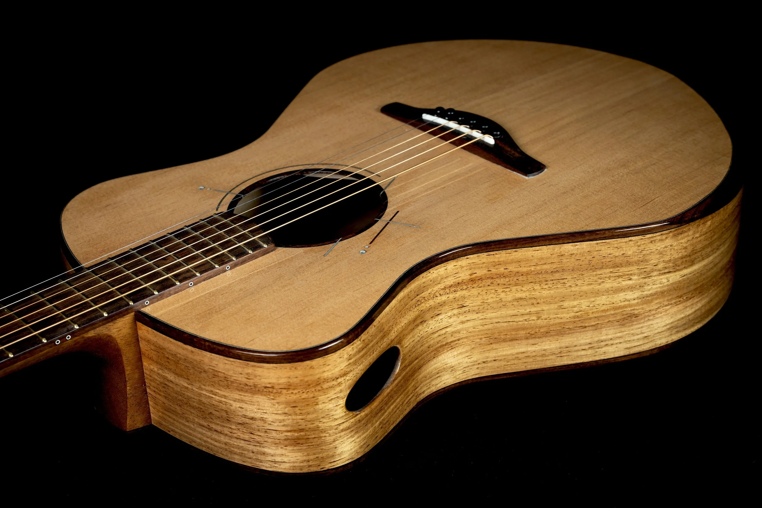 The C Model guitar features a compact concert sized body, perfect for players seeking comfort and ease of handling without sacrificing sound quality. Despite its smaller size, it delivers a full, robust tone that rivals larger-bodied guitars, making it an excellent choice for those who want rich acoustic performance in a more portable package.